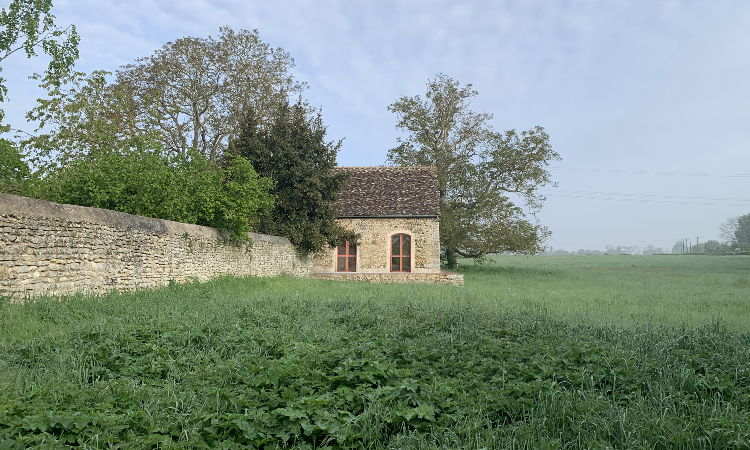 Le dessin vertical et voûté des percements permet de respecter la construction existante en répartissant les charges des épais murs de pierre. Les menuiseries sont colorées en rouge nacarat pour valoriser le vert de la prairie et renvoie aux teintes régionales.